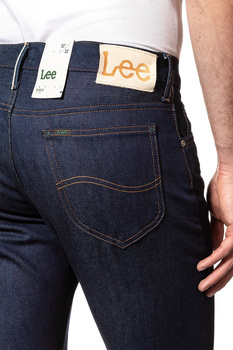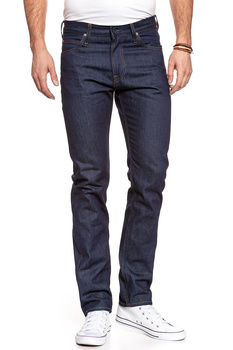 Męskie spodnie jeansowe w granatowym kolorze. Model ten charakteryzuje dopasowany krój, średni stan oraz zwężane nogawki. Na tylnej kieszeni oraz pasku charakterystyczne logo producenta.