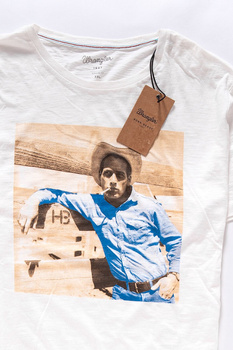 Męski t-shirt marki Wrangler w kolorze ecru. Charakteryzuje go regularny krój. Na klatce piersiowej duży nadruk - kadr z filmu The Left Handed Gun z 1958 roku, w którym widoczny na princie Paul Newman wcielił się w postać Billy The Kida. Gratka dla koneserów amerykańskiej kinematografii.