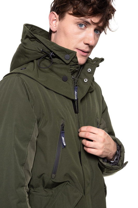 Męska kurtka zimowa w modnym kolorze khaki. Charakteryzuje ją regularny krój, liczne kieszonki, kaptur oraz ocieplenie na nadchodzące, zimne dni.