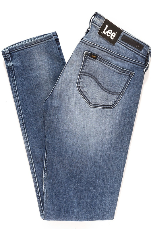 Damskie spodnie jeansowe w niebieskim, wycieranym kolorze. Model ten charakteryzuje dopasowany krój, niski stan oraz zwężane nogawki. Na tylnej kieszonce charakterystyczne logo producenta.