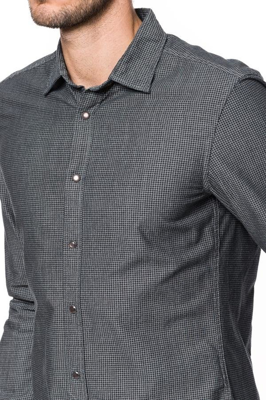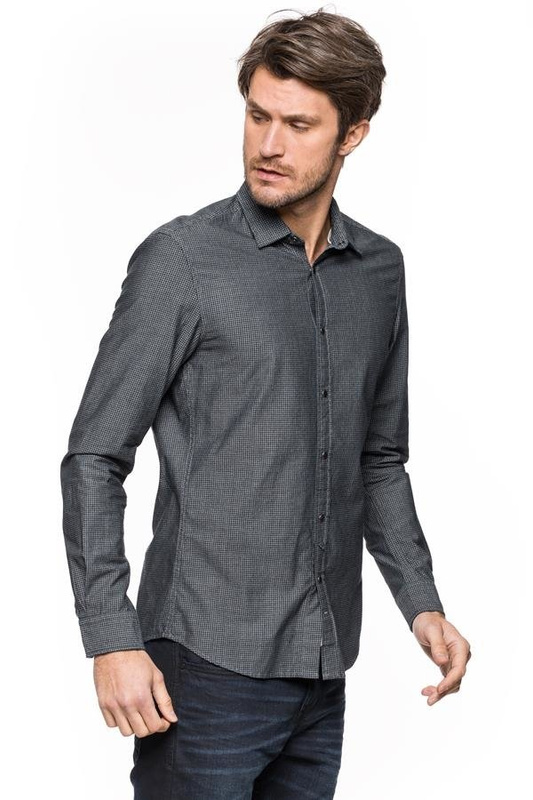 - Koszula marki Tom Tailor w dopasowanym kroju. Wzór w drobną pepitkę, szary odcień oraz zapięcie na zatrzaski.