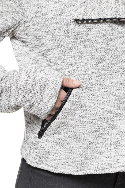 - Designerski, dzianinowy żakiet o lekko dopasowanym kroju w odcieniu jasnoszarego melanżu. Kontrastujące czarne wstawki na ramionach oraz zamki nadają odzieży unikalny charakter.