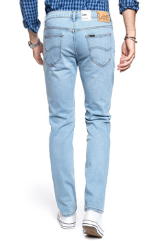 Męskie spodnie jeansowe w niebieskim kolorze. Charakteryzuje je dopasowany krój, zwężane nogawki oraz średni stan.