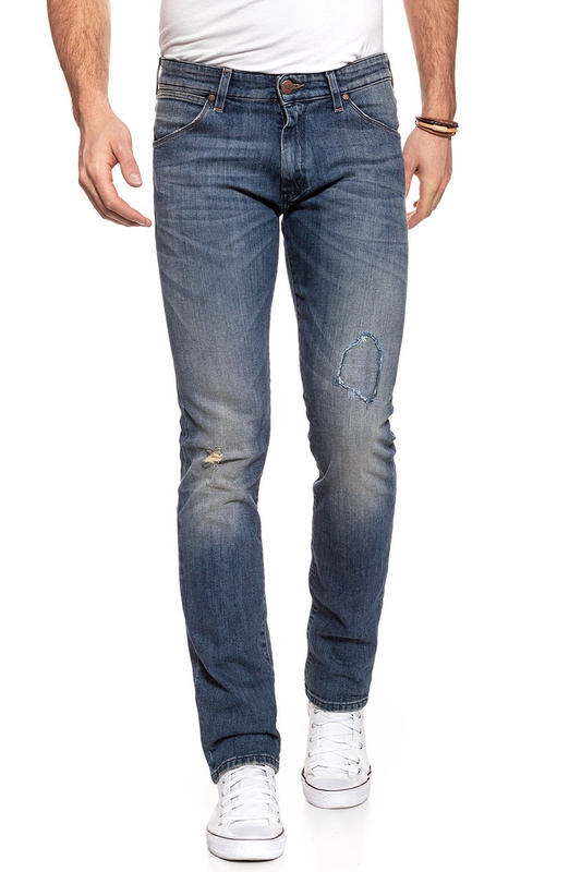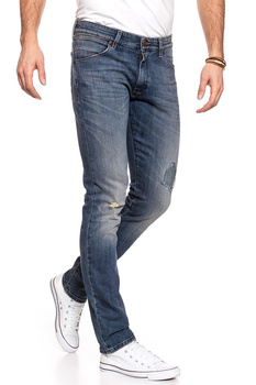 Męskie spodnie jeansowe w niebieskim, lekko wycieranym odcieniu. Model ten charakteryzuje dopasowany krój, średni stan oraz zwężane nogawki. Na pasku znajduje się charakterystyczne logo producenta.