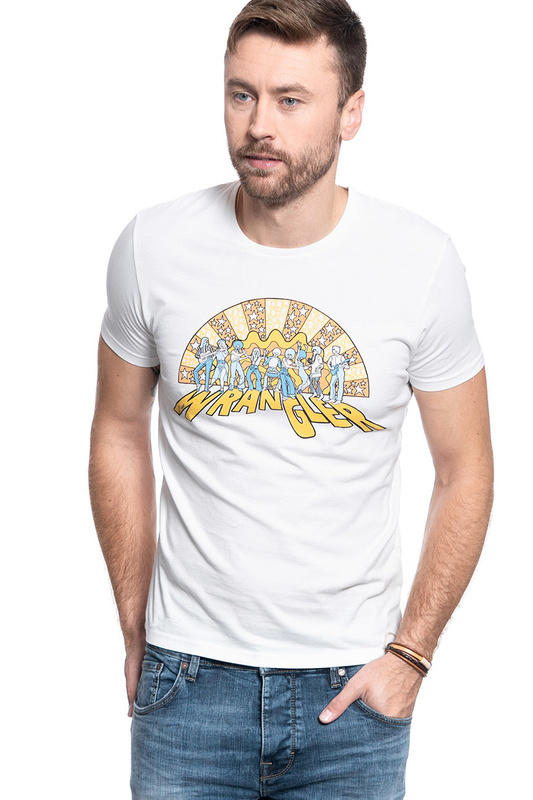 - Koszulka marki Wrangler w regularnym kroju. Oryginalny, przełamany odcień bieli oraz nadruk w stylu retro z przodu.
