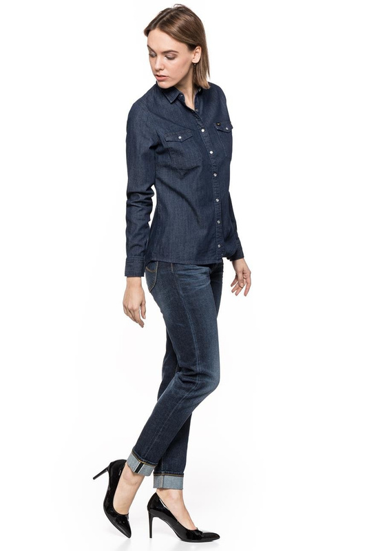 - Damska jeansowa koszula z długim rękawem. Dopasowany krój idealne układa się na ciele. Na lewej kieszonce charakterystyczne logo producenta.