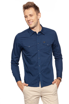 - Klasyczna koszula marki Lee. Klasyczny, granatowy odcień oraz kieszenie typu western. Designerski wzór w delikatną pepitkę.
