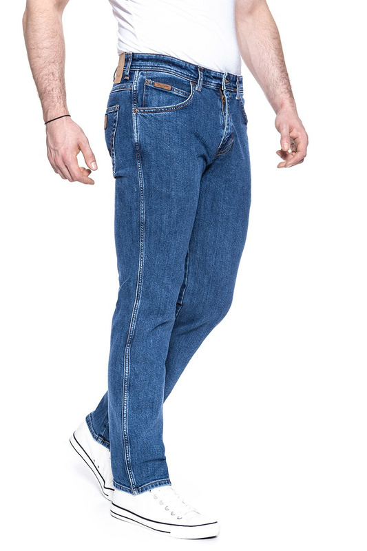 - Klasyczne spodnie marki Wrangler. Regularny stan oraz prosta nogawka. Bardzo modny w tym sezonie niebieski odcień.