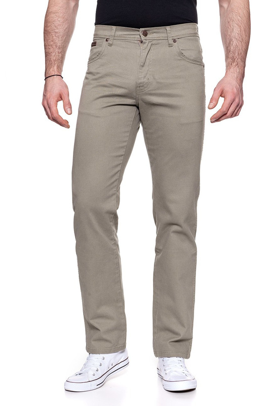 Męskie spodnie materiałowe marki Wrangler w odcieniu khaki. Model ten charakteryzuje wyższy stan oraz prosta nogawka. Na tylnej kieszonce charakterystyczna, skórzana naszywka z logo producenta.