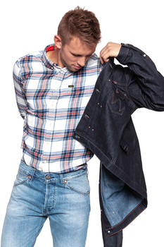 • Męska jeasnowa kurtka w granatowym odcieniu. Zapinana na miedziowane, sygnowane guziki. Z przodu nad lewą kieszenią charakterystyczna metka z wyszywanym logo Wrangler.