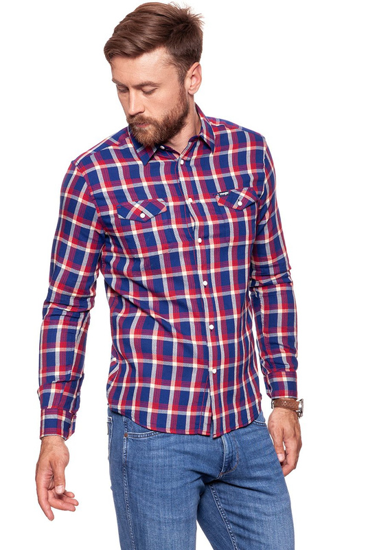 Męska koszula materiałowa w wielokolorową kratę. Regularny krój oraz dwie praktyczne kieszonki zapinane na guziki. Na lewej kieszonce charakterystyczne logo producenta.