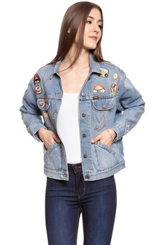Damska kurtka jeansowa marki Wrangler w jasnoniebieskim kolorze. Charakteryzuje ją regularny krój, hipisowski styl z licznymi przetarciami i naszywkami oraz zapięcie na guziki.