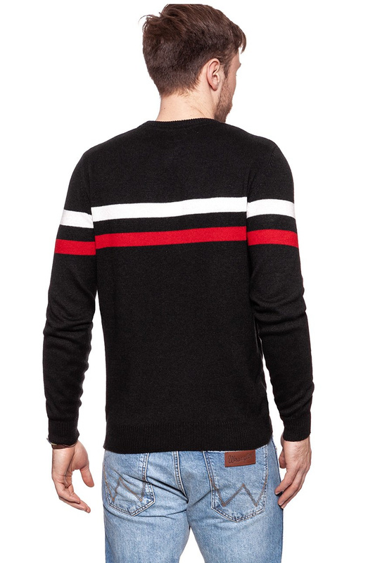 Męski sweter z domieszką wełny w czarnym kolorze z biało-czerwonymi paskami. Regularny krój oraz ściągacze w rękawach i na dole to dodatkowy atut tego modelu. W dolnym lewym rogu charakterystyczna metka producenta.